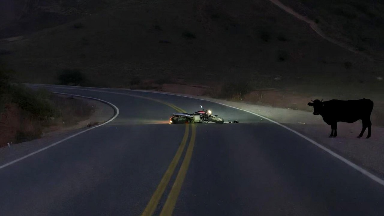 En este choque con vaca específico, el joven perdió el control tras el impacto, derrapando varios metros y sufriendo heridas que requirieron atención inmediata. La escena fue caótica, con el motociclista tendido en el asfalto, esperando auxilio en medio de la nada, un escenario que podría haber sido evitado con medidas básicas de seguridad vial.
